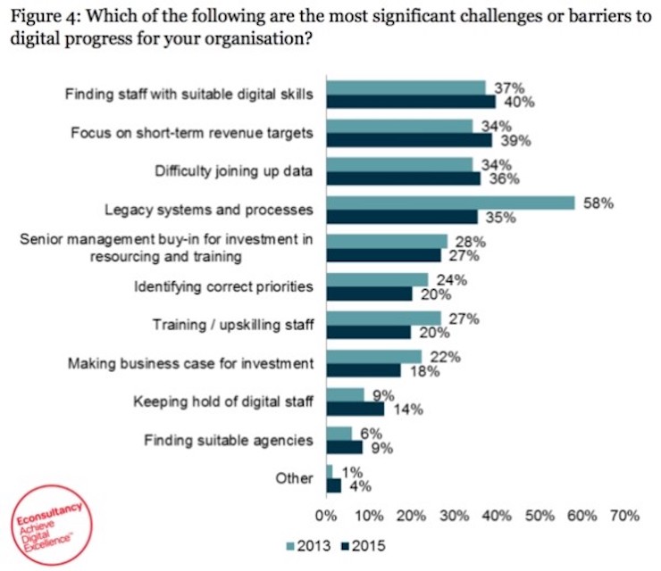 Vous vous doutez que pour assurer cette fameuse transition numérique il ne suffit pas de lire des bouquins, quoique je vous recommande humblement les deux miens ;-) Le livret blanc cité plus haut nous apporte des données précieuses sur les principaux challenges rencontrés :