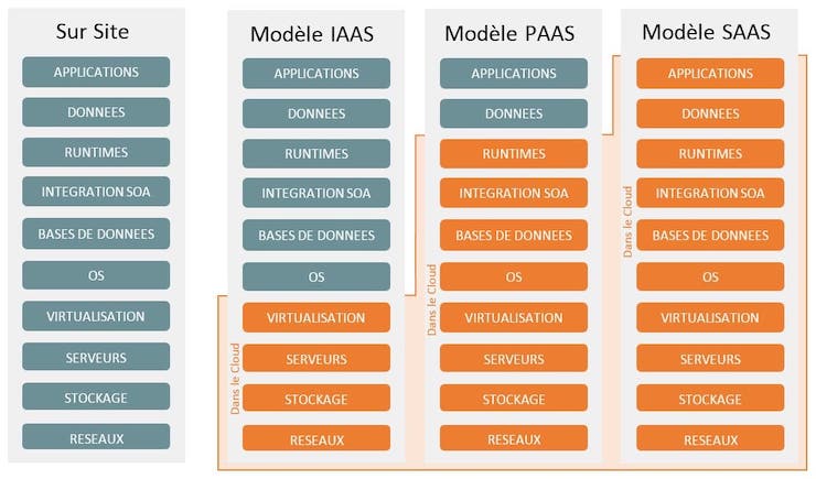 Comme vous pouvez le voir dans ce schéma, le cloud peut être adopté complètement (colonne de droite), partiellement (colonnes centrales) ou pas du tout (colonne de gauche). Avec cette image en tête, vous pouvez maintenant transposer ça dans le monde de l’informatique d’entreprise et comprendre la différence entre les différents modèles (IAAS, PAAS, SAAS, DAAS, BAAS : quel modèle cloud choisir pour vos solutions de performance industrielle ?).