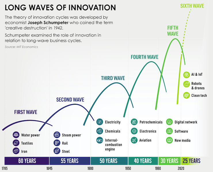 Comme vous pouvez l’observer sur ce schéma, les cycles raccourcissent, mais sur une période de 250 ans. De même, nous pouvons associer à chacun des cycles des révolutions industrielles (rappelons que nous sommes en plein milieu de la quatrième, la révolution numérique). Là où je reste cependant sceptique, c’est sur l’évaluation arbitraire du dernier cycle en date, la sixième vague, dont on ne connait pas encore la durée (jusqu’à preuve du contraire).